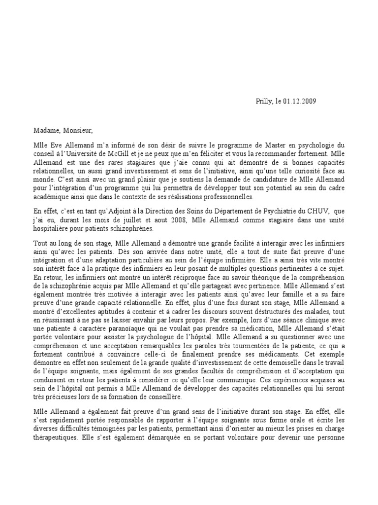 Exemple De Lettre De Recommandation D Un Maitre De Stage Motivation Developement Personel