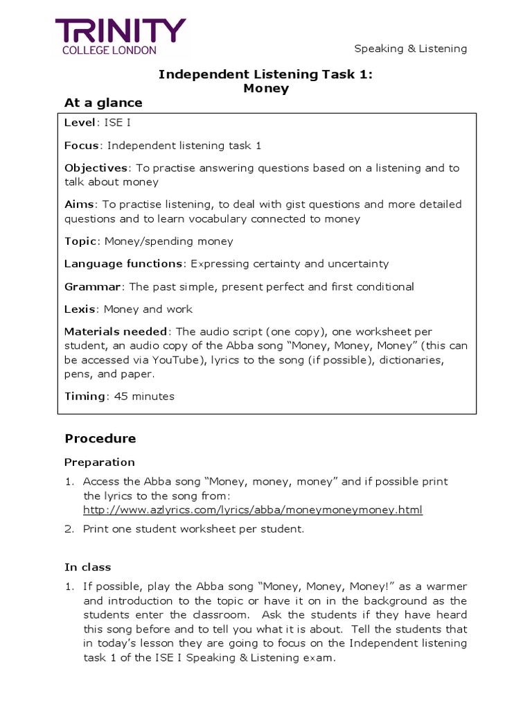 Ise I Independent Listening Task 1 Ca1 Money Test Assessment Cognition