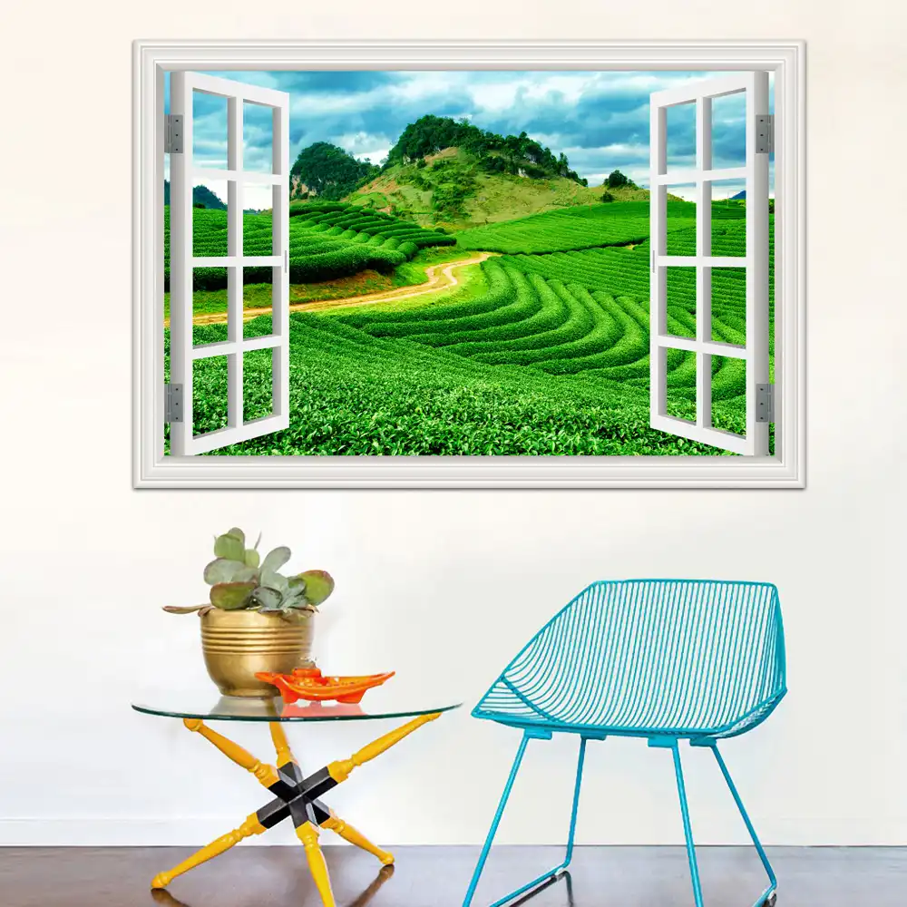 Pegatina De Pared Para Ventana 3d De Una Pieza Papel Tapiz Con Paisaje De Te Verde Arte Para Mural De Vinilo Accesorios De Decoracion Del Hogar Y Cocina Wall Sticker Wall Sticker Green3d Window